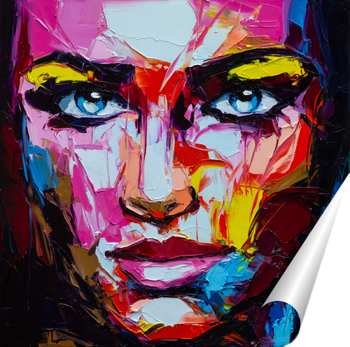 Описание плаката Из коллекции "эмоции в красках". Смесь абстрактного стиля, фовизма и поп-арта, портрет-компиляция из разных образов и воспоминаний. Выполнен на холсте исключительно мастихином, крупные размашестые мазки придающие стиль и силу выражению. Для оформлени