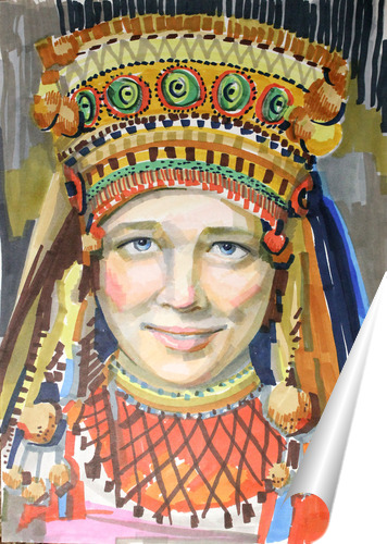 Описание плаката Образ молодой красивой девушки в национальном костюме. Картина выполненна в ярком, сочном коллорите, художественными макерами на бумаге.