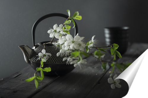 Описание плаката Арт-композиция с участием чайника, веточки цветущей вишни и чашечки на деревянном столе.