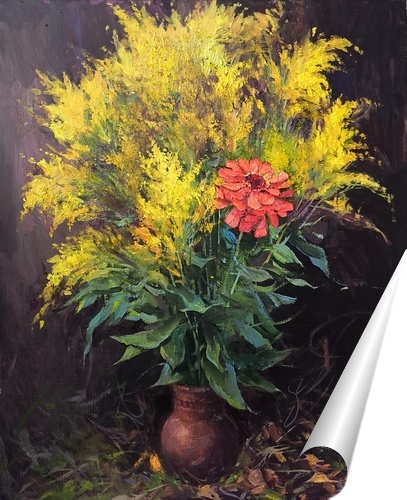 Описание плаката Картина написана с натуры, в осенний день в саду. Так захотелось передать контраст жёлтого золотарник и яркой красной цинии. На фоне тёмного осеннего леса
