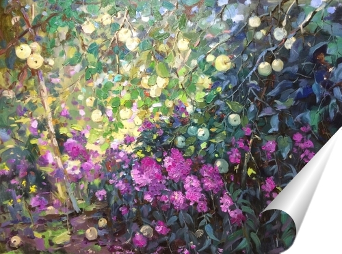 Описание плаката Художник найдёт сюжет для своей работы даже в скромном уголке летнего сада, где роскошствуют цветы в содружестве со щедрой яблонькой