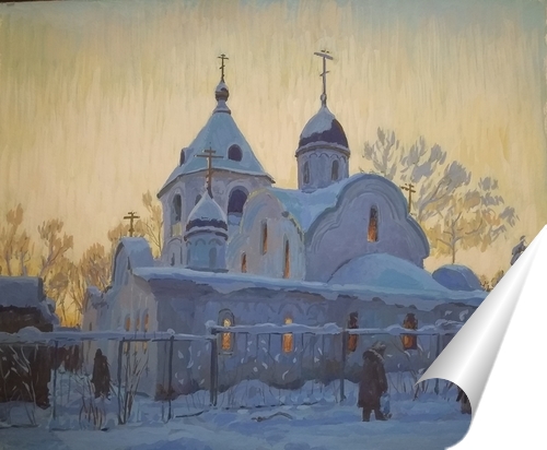 Описание плаката Зимний день клонится к вечеру, солнце садится, слегка касаясь мягким золотистым светом верхушек деревьев и отражаясь в куполах и крестах храма. Сегодня канун Богоявления, мороз, минус 20, как часто бывает в это время.. В храмы тянутся люди за крещенс