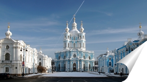 Описание плаката Смо?льный собо?р — православный храм Санкт-Петербурга. Входит в состав архитектурного ансамбля Смольного монастыря, который находится в Санкт-Петербурге на левом берегу Невы. Творение архитектора Бартоломео Растрелли уже почти 200 лет украшает город