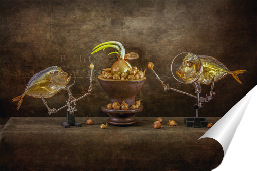 Описание плаката Натюрморт "Вомеры и выращивание лука" - из жизни предметов. Это попытка заставить обычные предметы показать свои скрытые возможности в необычной для них ситуации или положении... Попытка открыть новую историю их существования.