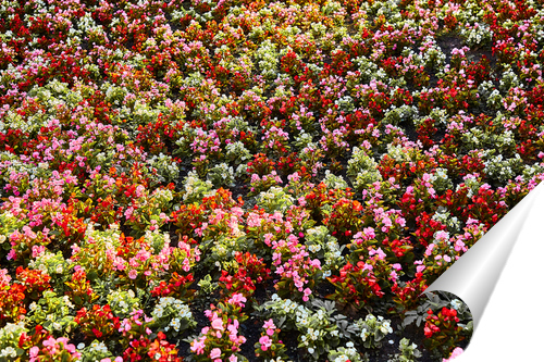 Описание плаката Удивительный сплошной яркий ковер из красных,розовых и белых цветов на большой клумбе