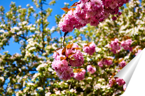 Описание плаката Весеннее цветение розовых пушистых цветов на фоне цветущей яблони с белыми цветами