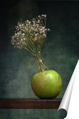 Описание плаката Зелёное яблоко - фотоэтюд с яблоком. Простая композиция, где главную роль играет свет, цвет, формы и пространственное расположение объектов съёмки.