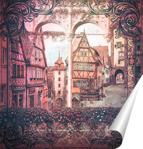 Описание плаката Ширма с изображением улочки старой деревушки в винтажном стиле, будет прекрасно смотреться в гостиной.