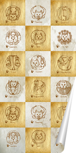 Описание плаката Ширма с множеством ячеек в каждой из которых можно увидеть забавных котов знаков зодиака, прекрасно дополнит ваш интерьер
