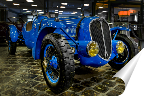 Описание плаката Спортивный родстер французской марки Delahaye_135СС. Стремительный синий автомобиль выглядит как воплощение скорости. Эта модель не знала поражений на гоночных трассах! Двигатель мощностью 115 л.с., максимальная скорость 160 км/ч