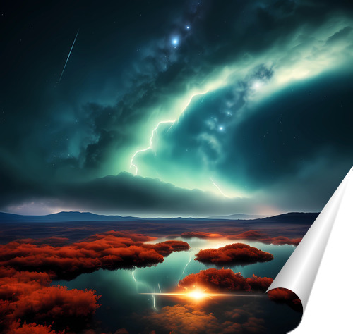 Описание плаката На этом изображении вы увидите красные кусты, расположенные в воде в равнинной местности. Великолепное звездное небо над ними преобразуется в многогранное зрелище, напоминающее большой сгусток энергии в виде туманности. Это место кажется волшебным, г