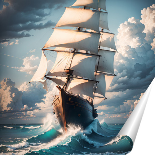 Описание плаката На этой картине изображен одинокий корабль, мужественно справляющийся с огромными волнами в середине океана. Облака тянутся к горизонту, создавая захватывающий и напряженный момент вечной борьбы природы с человеком.