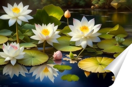 Описание плаката Постер с водными цветами на глади озера идеально подходит для библиотеки или холла.