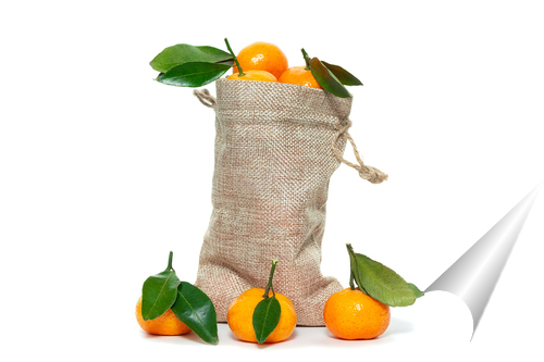 Плакат "Стопка мандаринов с изолированными листьями на белом фоне"