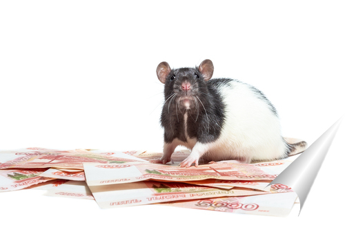Описание плаката Крыса с деньгами.ставка на деньги на изолированном белом фоне, концепция крысы с деньгами на новый год и Рождество