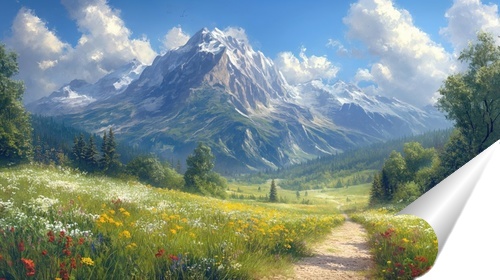 Описание плаката Вдохновляющий горный пейзаж, написанный на тему весны, напоминает о красоте и силе природы. Снежные вершины, зеленые луга, цветущие деревья и ручьи создают гармоничную композицию, полную света и жизни. Этот пейзаж вызывает чувство радости, надежды и