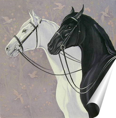 Описание плаката картина написана маслом на холсте, размер подрамника 60 х 60 см. На картине изображена пара красивых лошадей. Эта картина украсит интерьер спальной комнаты.