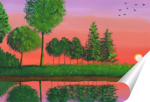 Описание плаката На картине изображен летний закат над озером, в котором преобладают яркие оттенки оранжевого, розового и красного неба, контрастирующие с различными оттенками зеленого цвета деревьев и травы. Небо сверкает теплыми тонами заходящего солнца, отбрасывая