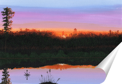 Отражение заката на спокойной глади озера придает композиции завораживающий вид, вызывая чувство умиротворения. Эта картина приглашает зрителей стать свидетелями пленительной красоты летнего вечера, где игра света создает чарующую и запоминающуюся атмосферу.