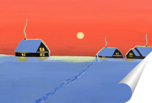 Описание плаката На картине изображена зимняя деревня, утопающая в сиянии заходящего солнца.