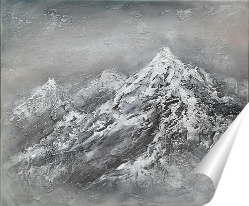Описание плаката Перед вами абстрактная картина, которая передает красоту и мощь заснеженных гор, на этой картине изображены вершины гор, их контуры оформлены с помощью текстурной пасты, которая создает ощущение объема и структуры, добавляет тактильность и реалистичн