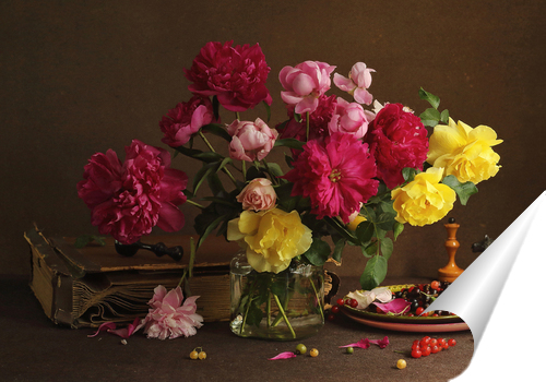 Описание плаката Во всей красе расцвёл пион, Кивал прекрасной розе он, Она была весьма умна, Колючей строгости полна.