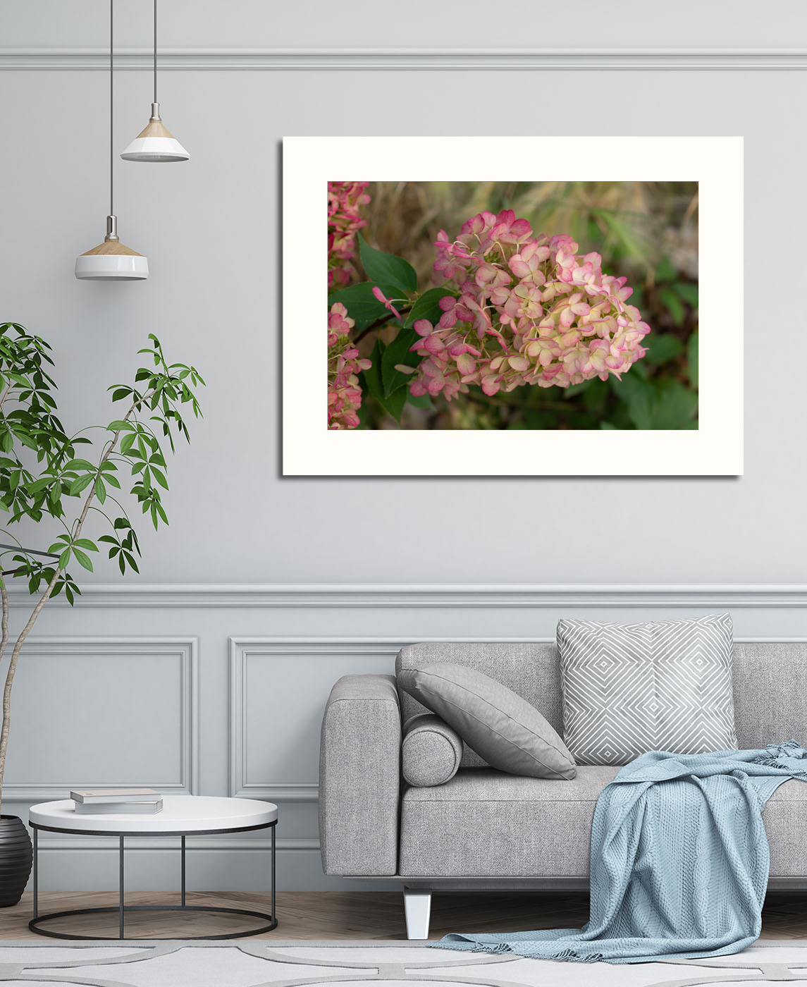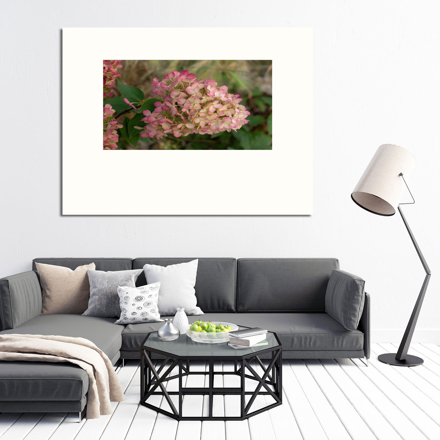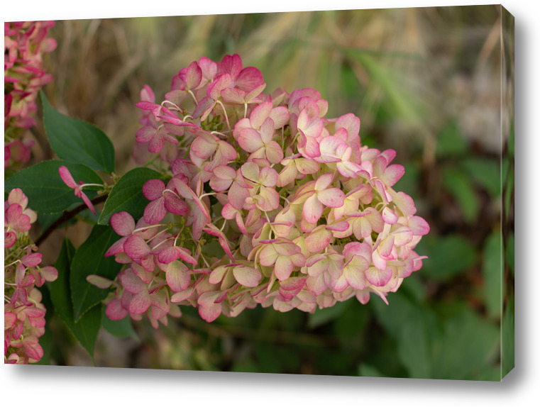 Описание плаката розовый цветок, цветущая гортензия, красивая картинка, аромат осени, витамины для глаз