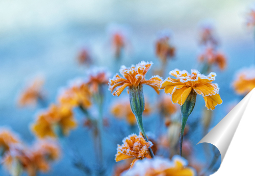 Описание плаката Яркие оранжевые цветы бархатцы покрытые колючими холодными кристаллами инея осенним морозным утром