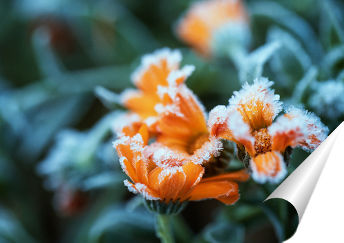 Описание плаката цветы календулы покрытые холодными кристаллами инея в морозное осеннее утро