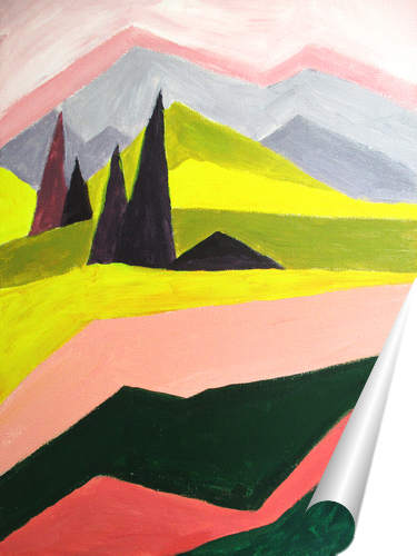 Описание плаката Абстрактная картина изображает горы и холмы в ярких цветах, таких как зелёный, розовый и чёрный. Смелые формы и динамичный контраст создают захватывающую атмосферу.