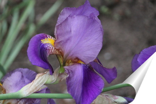Описание плаката яркий крупный садовый ирис темного фиолетового цвета пышно расцветший в саду
