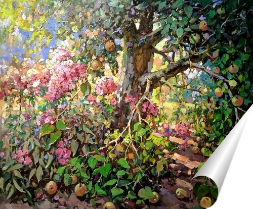 Описание плаката Уголок сада такой душевный, такой трогательный и умиротворённый, что состояние этого момента передаётся смотрящему на него. И к кисти тянется рука.