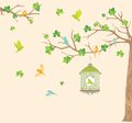 Изображение в интерьере дерева с птичками, клеткой и листвой наполнит неповторимой теплотой и уютом вашу комнату.