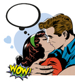 Наклейка в стиле поп-арт, с изображением целующейся пары, из комиксов. С диалоговым окном, куда вы можете вписать, что пожелаете.