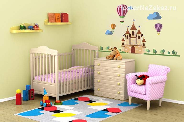 Избражение красочного замка с яркими шарами наполнит комнату сказкой, яркие цвета которые используются в наклейке придадут комнате теплоту и игривость. Лучше размещать данное изображение в детских или гостевых комнатах.