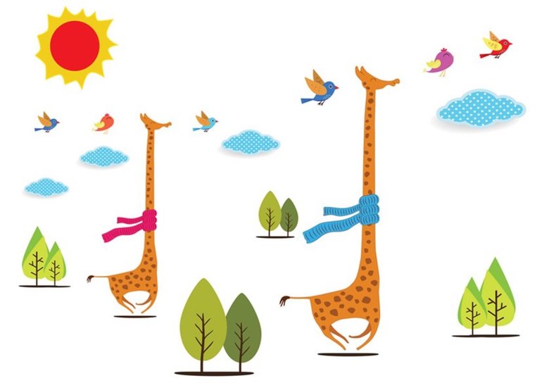 Изображение игривых жирафов поднимет настроение каждому находящимуся в комнате. Яркая цветовая гамма придаст изюминку помещению добавит элемент игры и разбавит цветами интерьерное решение. Данную наклейку лучше расположить в больших светлых помещениях. Лучше всего будет смотреться в детской, игровой, комнате подростка или гостиной.