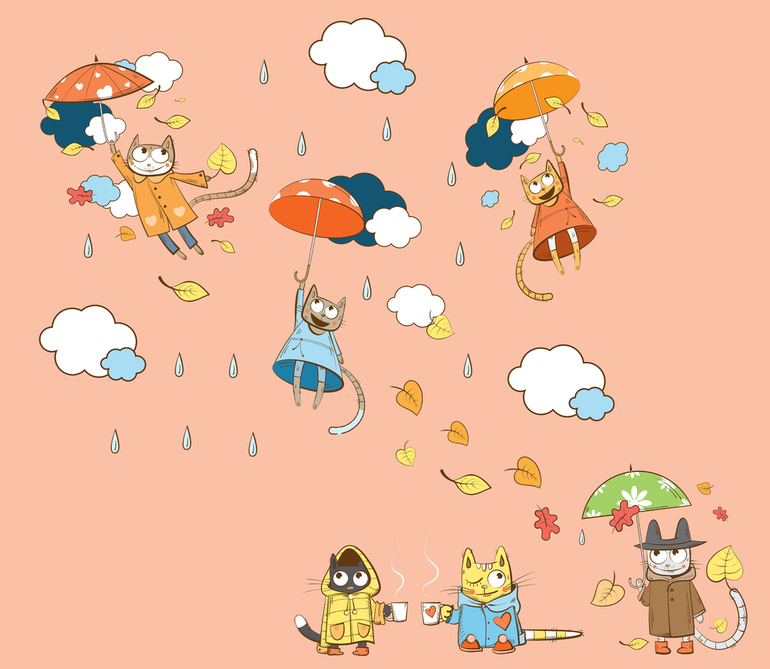 Интересная позитивная иллюстрация летящих котиков с зонтиками в осеннюю пору года, наполнит комнату теплотой и улыбкой.