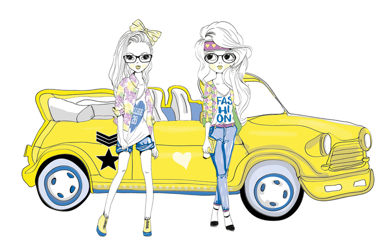 Маленькие модницы на фоне желтой машины будут хорошо смотреться в любой комнате подростка.Подойдут как для детской комнаты, так и комнаты подростка.