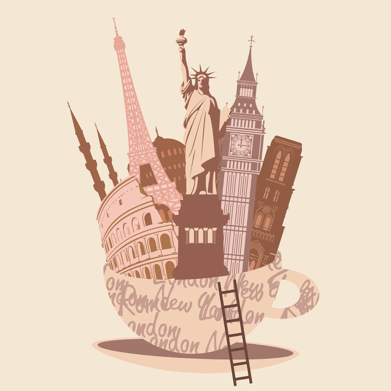 Изображение мировых достопримечательностей в одной чашке с лесенкой будет радовать ваш взгляд каждое утро.
