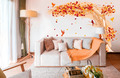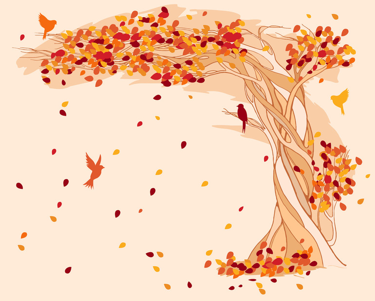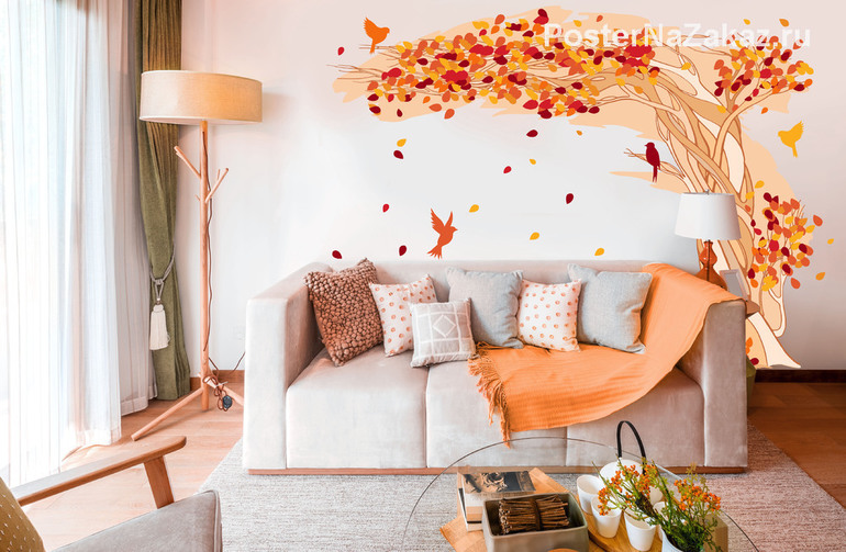 Изображение в интерьере большого Осеннего дерева с падающей листвой и птицами привнесет теплоту и уют в вашу гостиную.