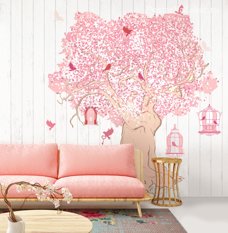 Наклейка в виде нежного, романтичного Дерева с ажурными клетками и разноцветными птичками наполнит теплотой и уютом вашу гостиную.