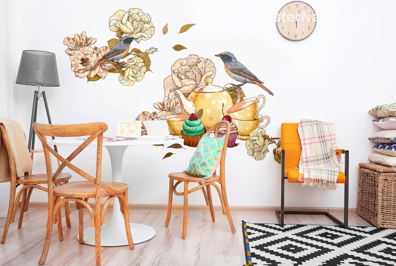 Наклейка в Чаепития с птичками, состоящая из чайного сервиза, розочек и птичек, отлично впишется в вашу обеденную зону.