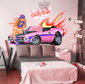Стильная и привлекательная девушка гонщица с розовой машиной добавит яркий акцент комнате. Можно располагать как в комнате девушки, так и молодого мужчины. Подойдет для светлых и темных стен.