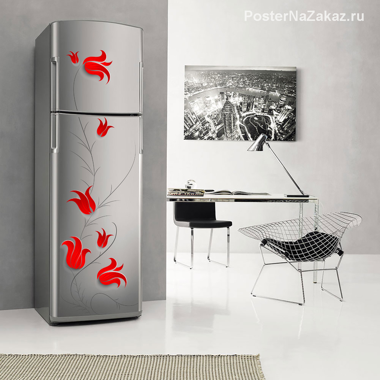 Красные тюльпаны, хорошо будут смотреться как на белом, так и на сером холодильнике, минимальное расположение, не навязчиво добавит изюминку вашему холодильнику и интерьеру кухни