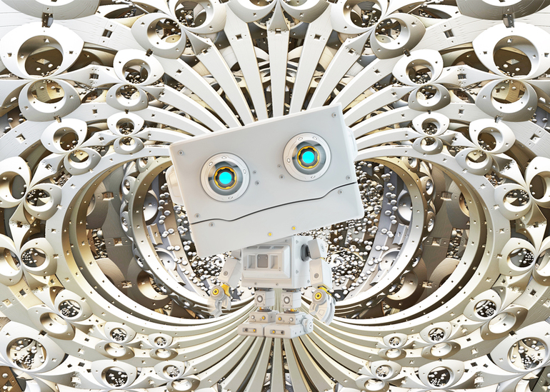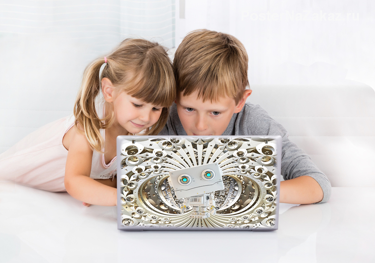 Наклейка для ноутбука в виде доброго, позитивного робота на фоне абстракции механизмов. Прекрасно будет смотреться на вашем ноутбуке.