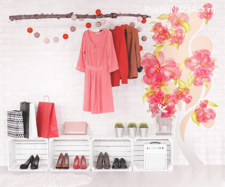 Наклейка в виде ажурного дерева с белым стволом и роскошными розовыми цветами будет отлично смотреться в прихожей.