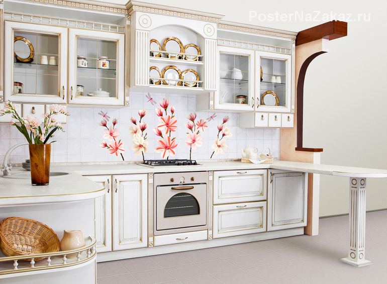 Изображение нежных цветов придадут стиль и изюминку помещению. Цветы дополнят существующий дизайн кухни. Лучше располагать в помещениях с классическим дизайном.