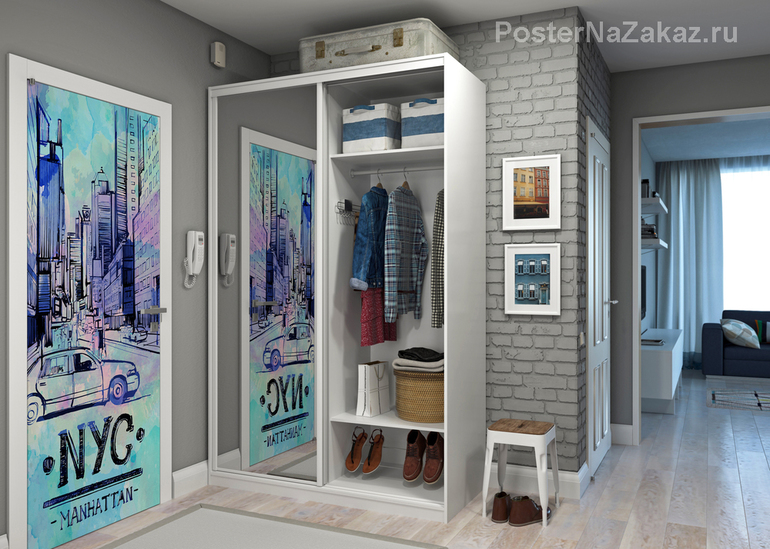 Наклейка с изображением исторического центра города Нью-Йорк - Манхэттен, в котором расположены высочайшие небоскрёбы будет отлично смотреться на двери.