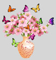 Наклейка в виде пышного букета цветов в красивой вазе с парящими разноцветными бабочками будет отлично смотреться в прихожей.