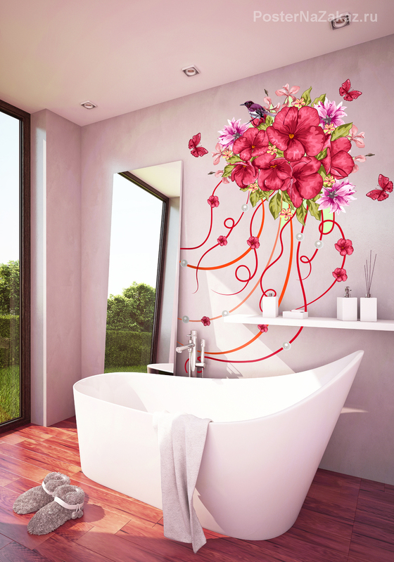 Изображение ярких цветов привнесет в Вашу ванную комнату волшебство и смелость. Сочные, красные цвета не оставят не замеченным такое оформление интерьера. Лучше располагать на светлых стенах в просторных, светлых помещениях.